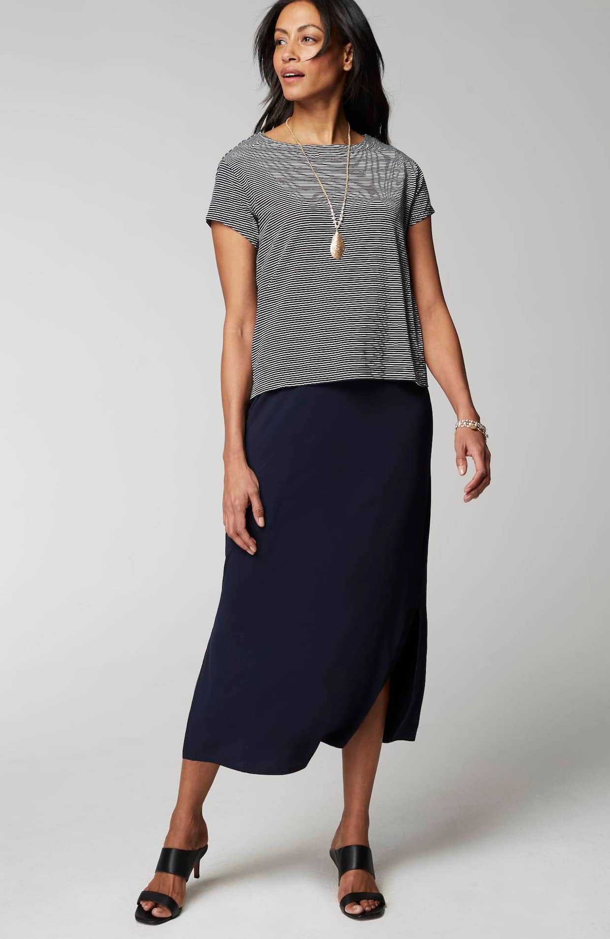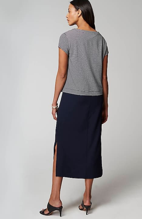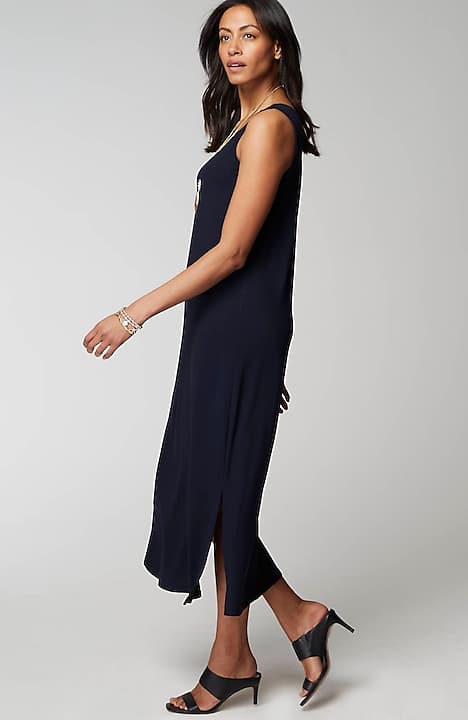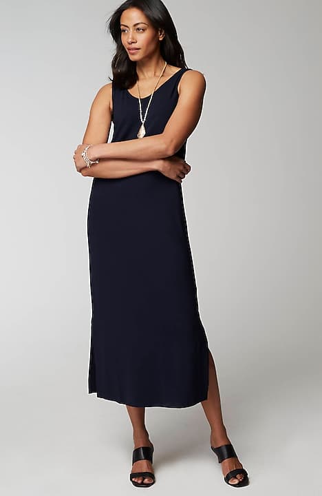 Our soft knit two-piece dress is designed to give you two dresses in one and multiple styling options. The top layer is designed with the comfort and ease of a boat-neck tee shirt, with dropped shoulders and side vents. The layer below is a sleeveless sheath dress with a V-neckline in the front and back and side vents. You can wear both pieces together any day, anywhere. Or you can wear either layer with something else. It’s a perfect option for vacation, work, events and weekends with flats, heels or sandals. Effortlessly packable knit style. Made from soft European yarns.