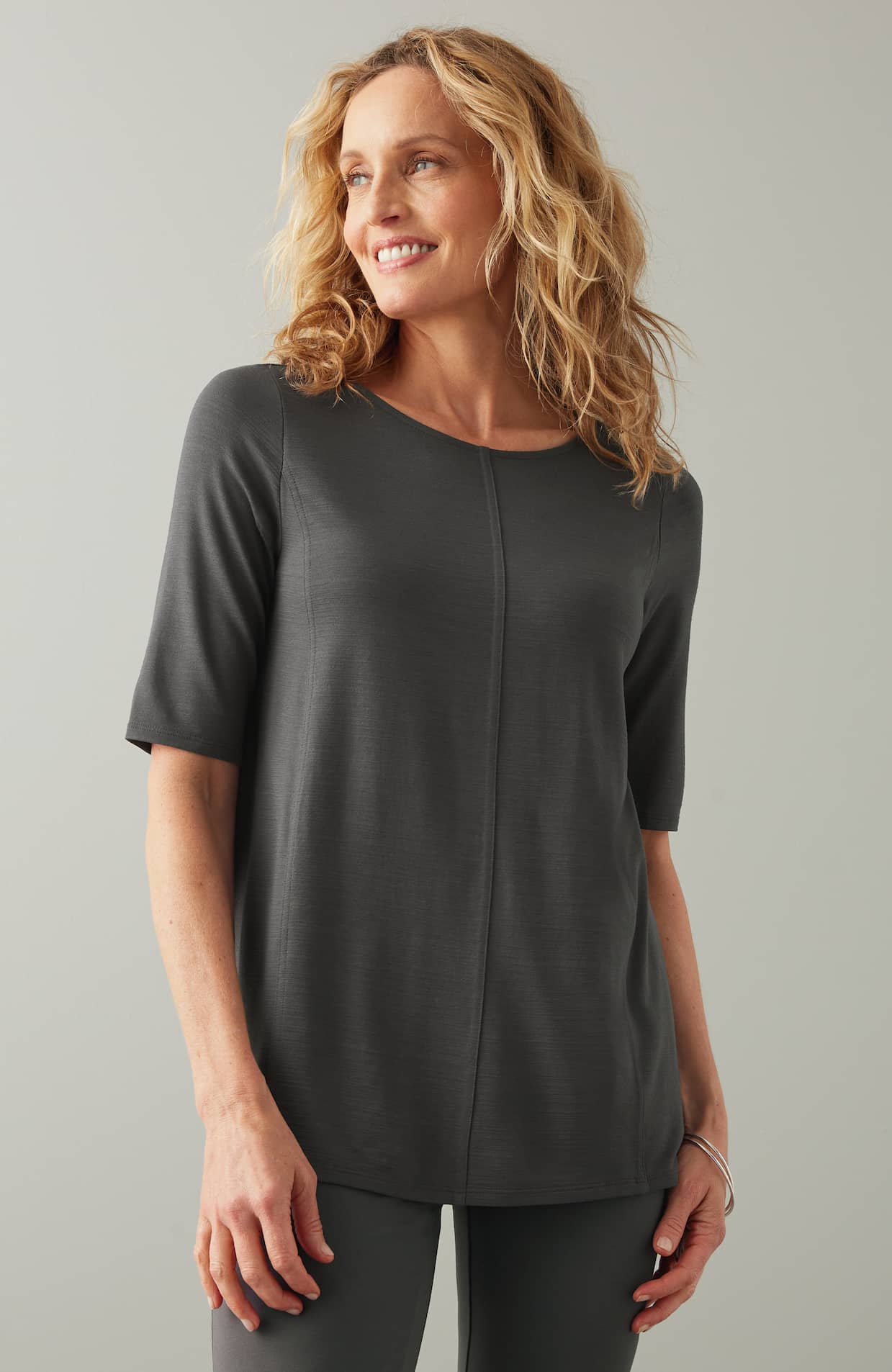 An elevated take on the everyday tee. Knit in a soft slub texture, it has a boat neckline and flattering forward seams. And you can feel good about wearing this style because it contains LENZING™ ECOVERO™ fibers. The manufacturing of LENZING™ ECOVERO™ Viscose fibers generates up to 50% lower emissions and water impact compared to generic viscose.