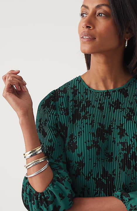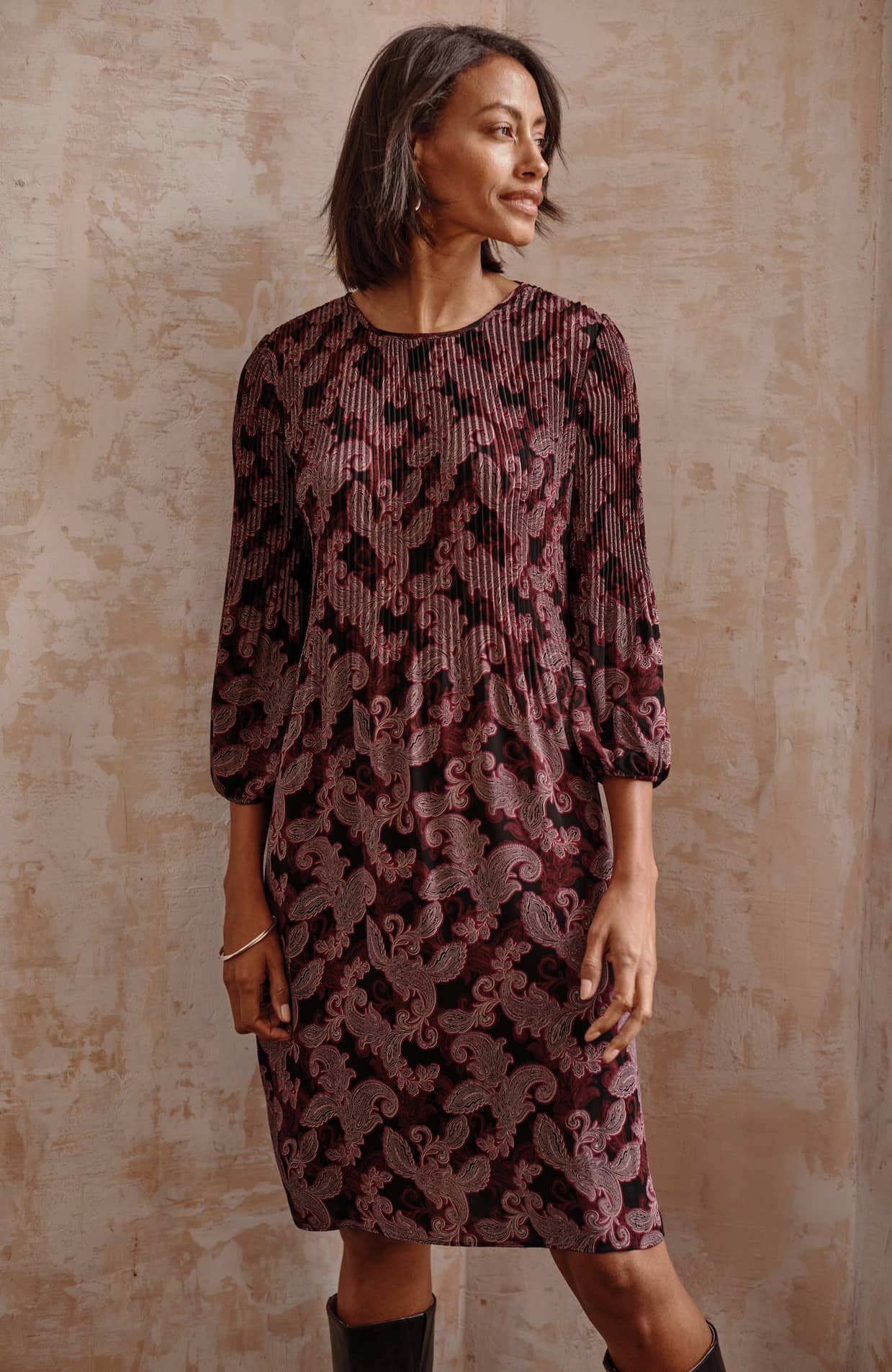 Our A-line dress makes a statement with sunburst pleats that flow with every movement. Back keyhole with button closure. Pair it with sandals or boots for workdays or weekends. Elasticized cuffs. Crew neckline.